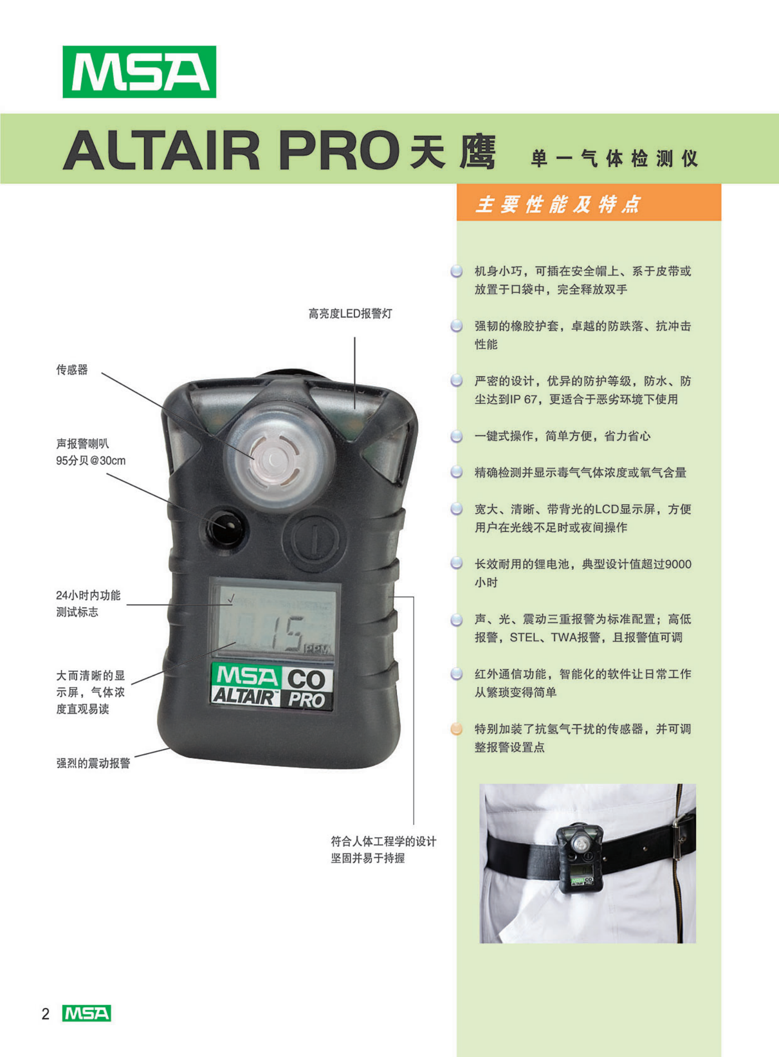 Altair Pro天鷹單一氣體檢測儀采用高精度的電化學(xué)傳感器檢測環(huán)境中的有毒氣體濃度或氧氣的百分比濃度。可分別檢測氧氣、一氧化碳、硫化氫、氯氣、二氧化硫、氨氣等13種有毒氣體。Altair Pro 天鷹已嵌入了數(shù)據(jù)記錄功能作為標(biāo)準配置,能自動記錄最近的50個事件。配合MSA 紅外適配器及軟件,可進行報警設(shè)置的修改,也可將儀表記錄下來的數(shù)據(jù)導(dǎo)入電腦,進行追蹤管理。